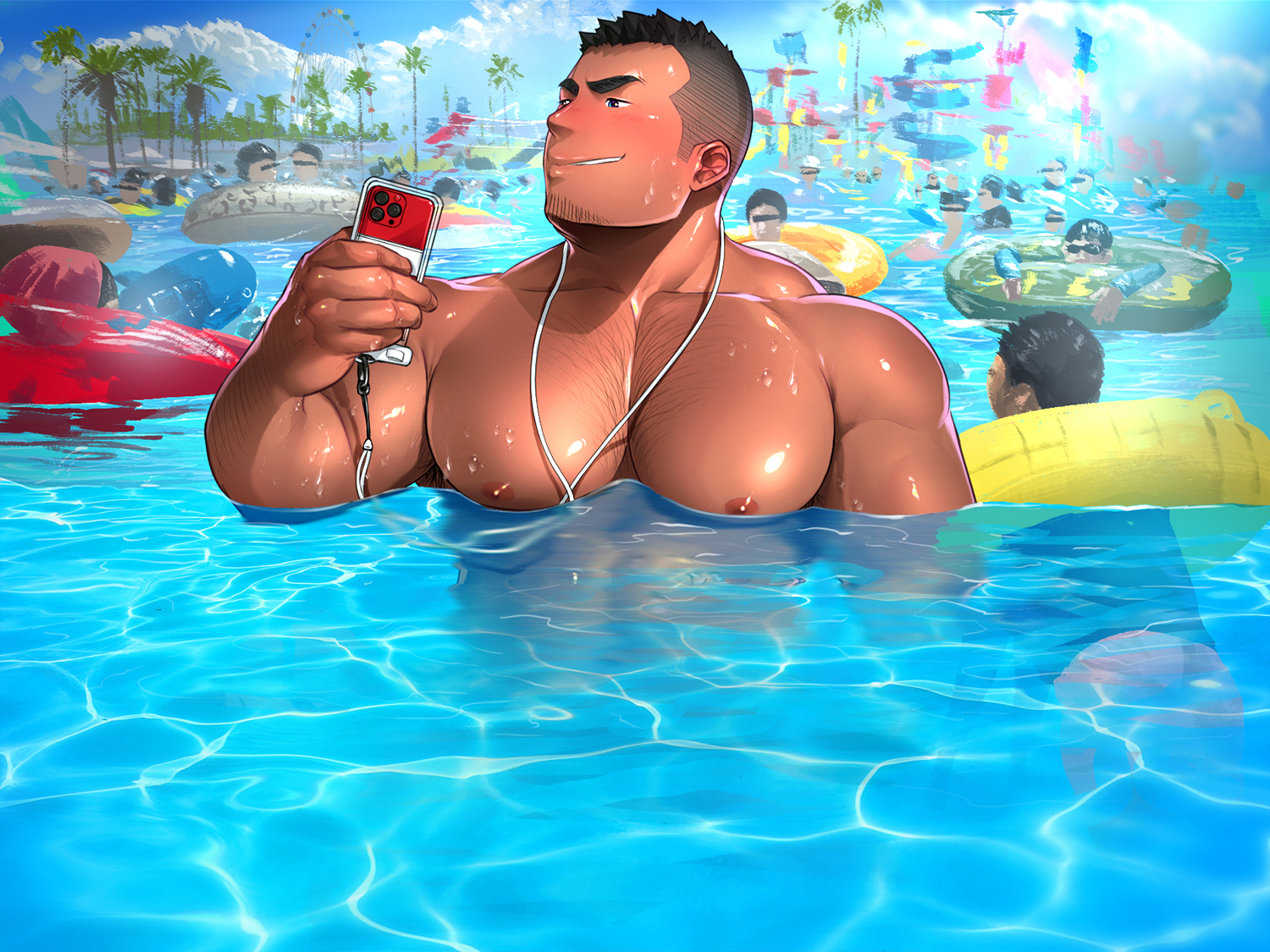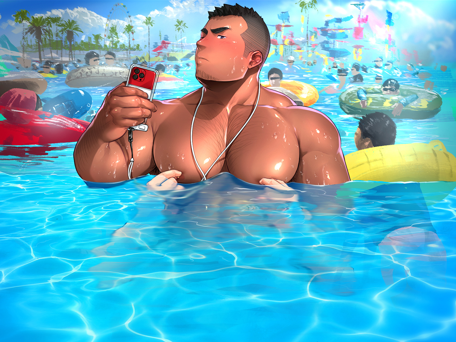가족 동반에 둘러싸인 수영장에서는 한눈에 서서 조금 부끄럽다