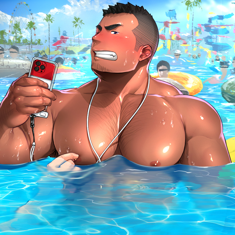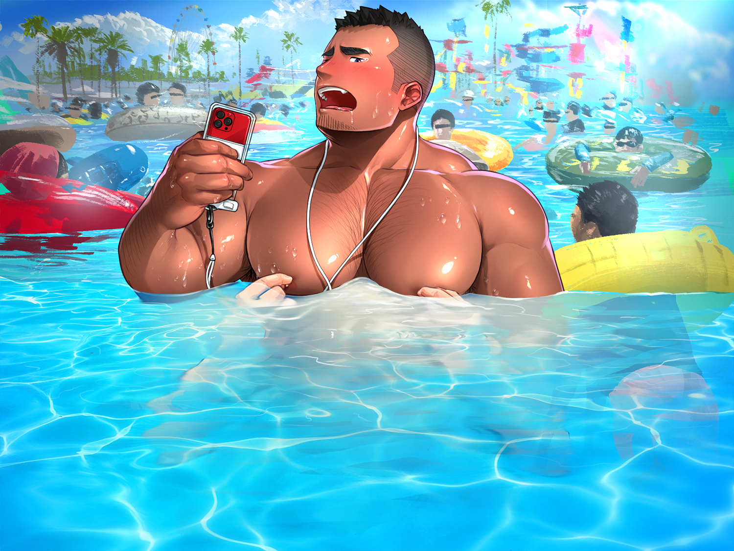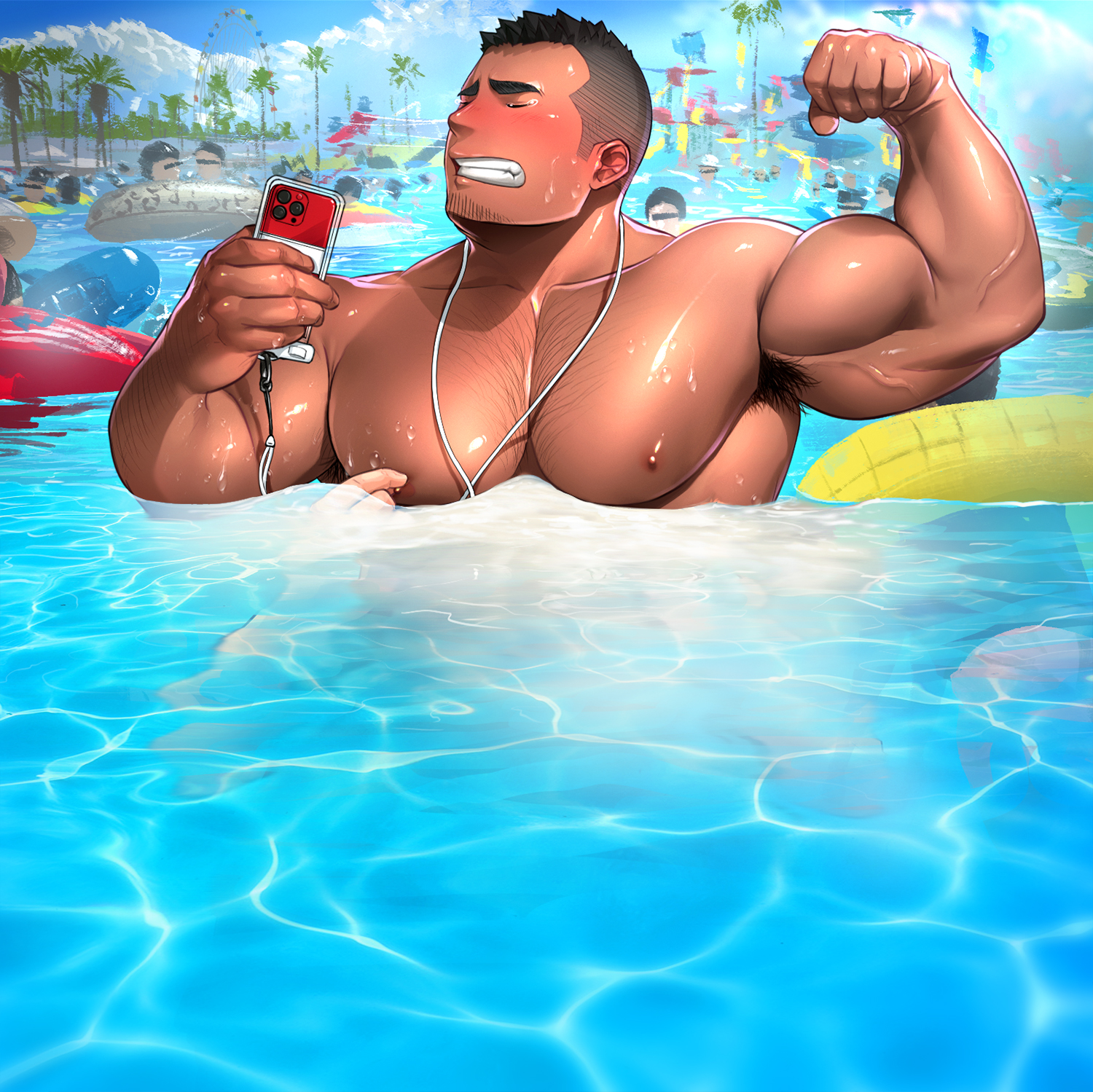 Fui à piscina de um certo parque de diversões com meus amigos do clube de levantamento de peso.